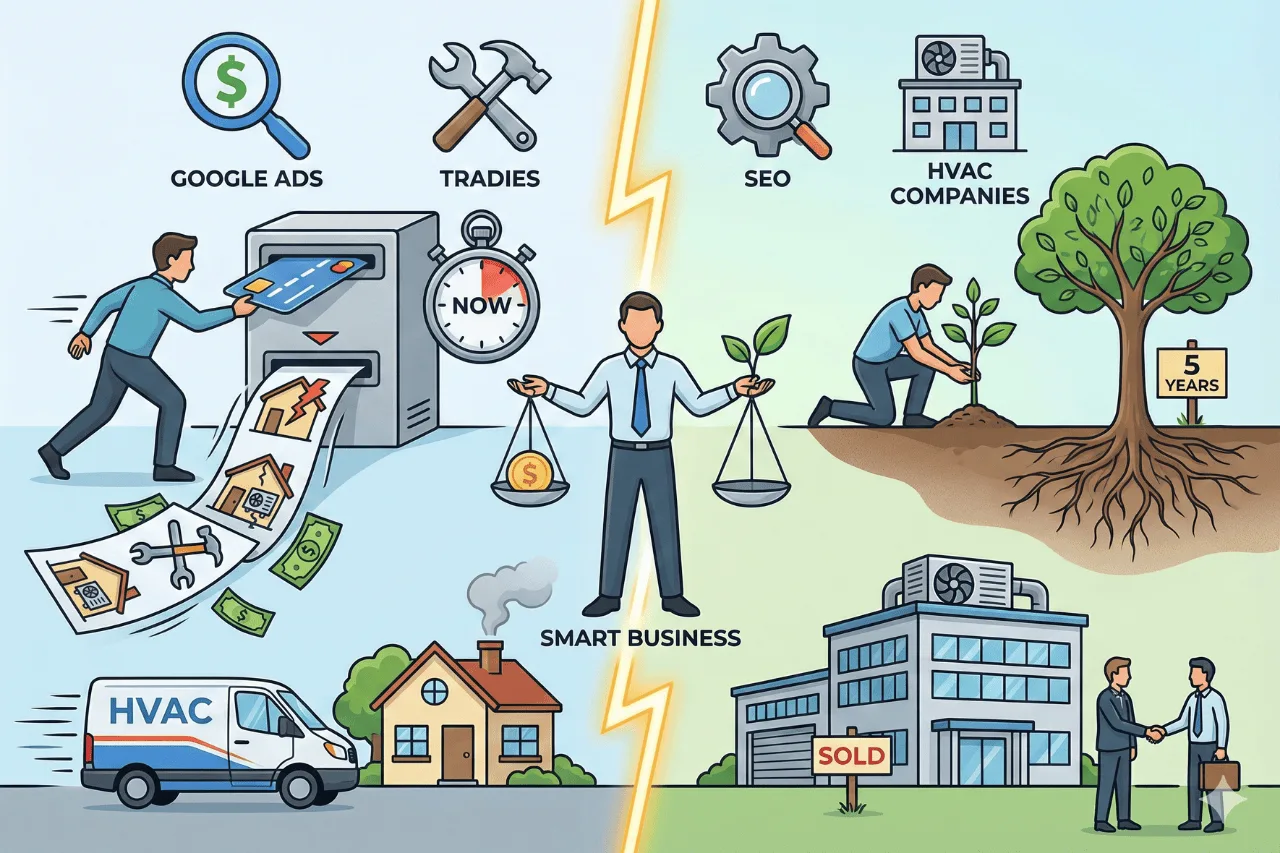 We get asked this every week: “Should I pay for ads or do SEO?” The honest answer? If you want jobs tomorrow, you need Google Ads for tradies. If you want to sell your business for millions in 5 years, you need SEO for HVAC companies.