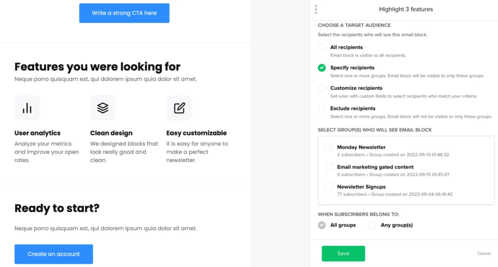 For sending targeted content, you have two choices. You can either send different emails to each group, creating multiple campaigns, or you can make a single email and use dynamic content blocks to show different content to each group in the same email. This saves time, as you don’t need to create multiple new emails.