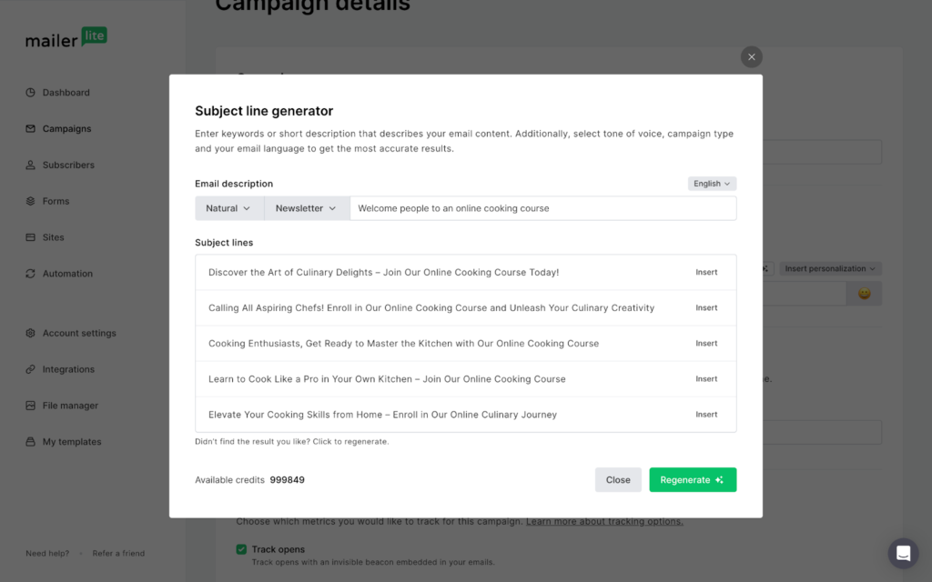 With MailerLite, you can quickly come up with several interesting email titles using the AI subject line generator. You get to choose the style and mood you want, and then the AI takes care of the rest! This not only saves time but also sparks your creativity.